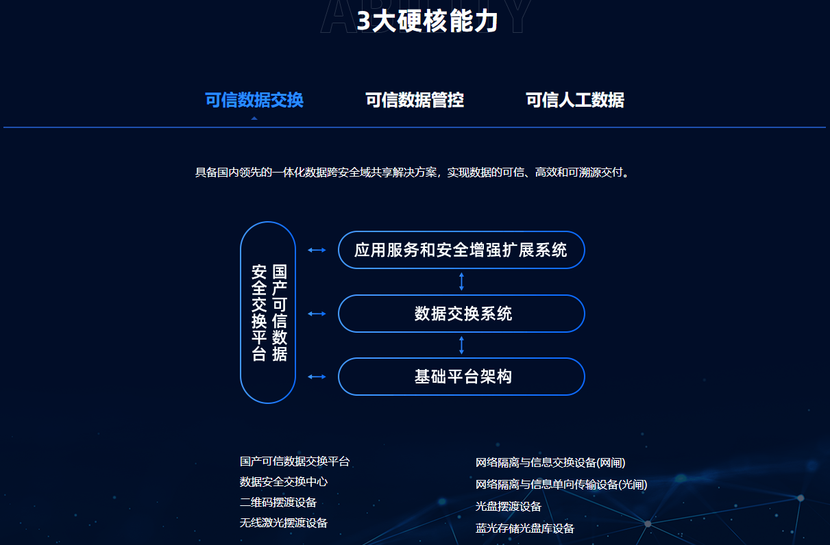 公司秉承“打造军民融合数智安全领军企业”,专注于为客户提供可信数据交换、可信数据管控和可信人工智能产品和解决方案。公司自主研发的国产可信数据安全交换平台具备国内领先技术水平,相关核心产品获得权威检测机构——公安部第三研究所认证认可并采购使用。