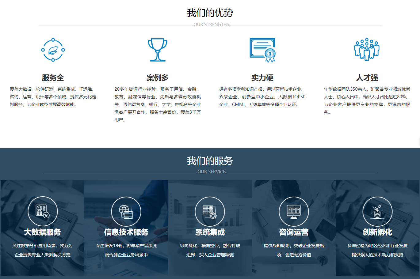 年华数据公司在智慧城市、数据治理、数字政府等领域深耕多年,长期致力于政府、企业的数据清洗、加工、处理、开发利用等服务,数据中台行业技术处于行业领先,具备成熟的数据中台建设能力、数据资源体系建设能力、定制化软件开发能力、信息化系统集成能力、业务运营支撑、市场营销咨询能力。抢抓数据价值化新机遇,把握以数据为关键要素的数字经济,年华数据公司作为数据要素领域的先行者,成为贵阳大数据交易所首批数据商,为数据买卖双方提供数据产品开发、发布、承销和数据资产的合规化、标准化、增值化服务,助力全省乃至全国政府、企业的数字化转型,是跨行业、复合型业务支撑服务经验的大数据领域综合性专业公司。