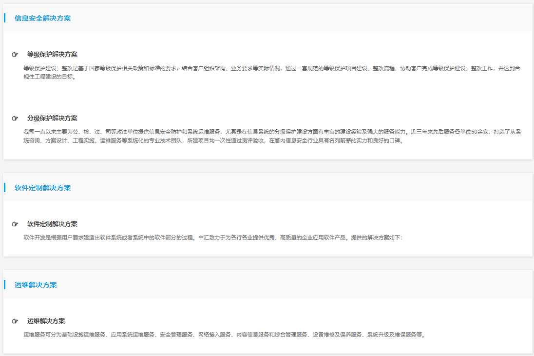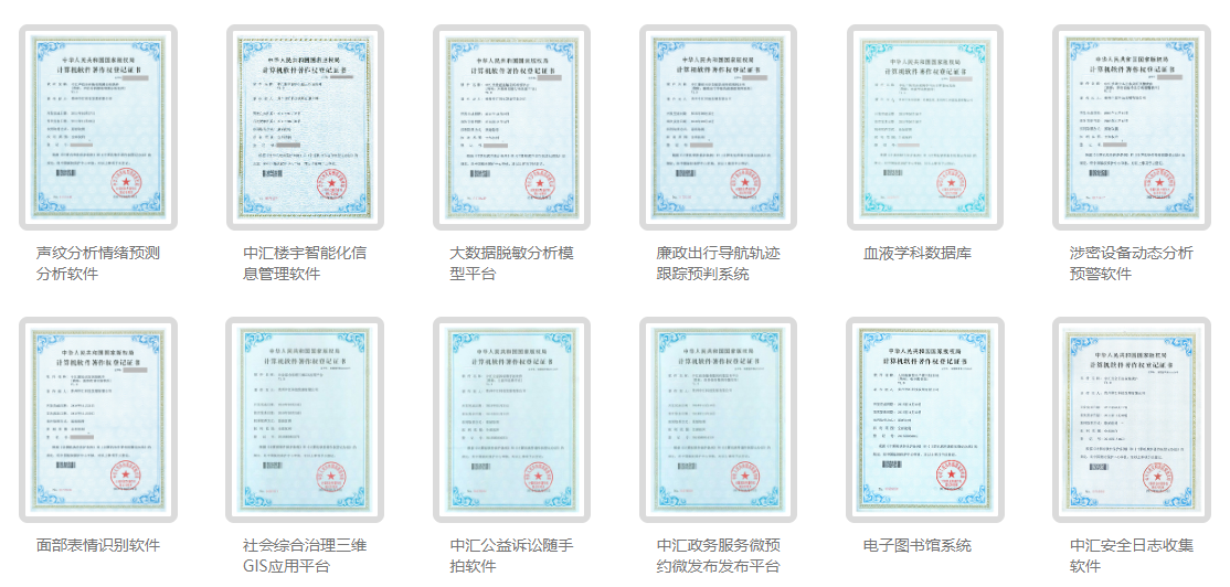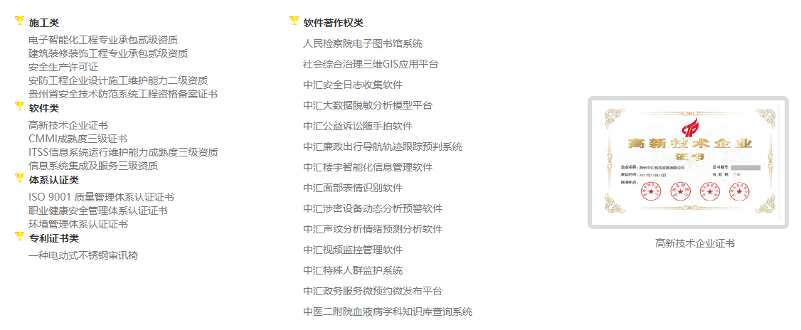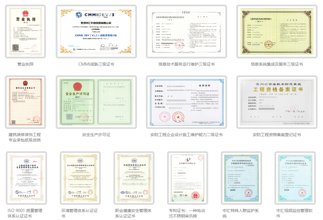 中汇科技自成立以来,先后获得电子与智能化工程专业承包二级资质、涉及国家秘密的信息系统集成及运维服务资质、计算机信息系统集成与服务三级资质、ITSS信息技术服务运行维护三级证书、安防工程企业三级资质及通过了ISO9001质量管理体系认证并取得多项软件著作权。