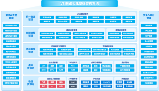海誉云™ CloudBasis VSIP虚拟化基础架构系统(VSIP)是基于信创技术架构的虚拟化平台产品,通过全自主、高可控、高性能的虚拟化资源调度引擎,实现对公有/行业/私有云数据中心相关服务器、存储、网络等IT基础设施进行云计算基础架构(IaaS)管理,VSIP将数据中心作为统一的云基座进行资源池化、计算虚拟化、网络虚拟化、存储虚拟化、资源调度监控及全生命周期安全审计管理,可同时纳管飞腾、鲲鹏、海光、龙芯、兆芯等主流信创芯片服务器和X86服务器,助力国内“2+8+N”行业数据中心信创云基础设施建设和国产化升级替代,为用户构建一云多芯、稳定可靠、安全可控、运维高效的虚拟化信创云基座服务。