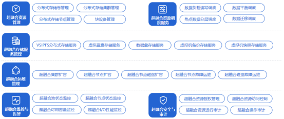 海誉云™ CloudBasis VSIP-HCI超融合基础架构系统将自主VSIPFS超融合分布式存储与计算虚拟化、网络虚拟化功能集成到单一宿主服务器节点和资源池,兼具VSIP虚拟化基础架构系统的资源统一管理、资源调度管理、存储服务管理、网络服务管理、高可用管理、服务管理、运维管理、监控与告警管理、安全与审计管理等核心功能,同时具备以下超融合基础架构相关核心功能。