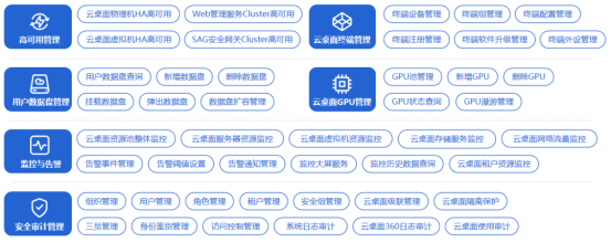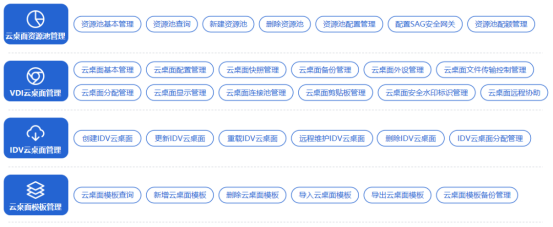 海誉云™ CloudBasis DCSS安全云桌面系统通过自主SAG云桌面安全访问网关和自适应多通道FastRAP桌面远程显示控制协议,可对VDI数据中心云桌面计算服务和IDV边缘端云桌面计算服务进行统一资源管理和快速交付,具备云桌面资源管理、VDI云桌面管理、IDV云桌面管理、云桌面模板管理、云桌面终端管理、云桌面GPU管理、用户数据盘管理、云桌面运维管理、监控与告警管理、安全与审计管理等核心功能。