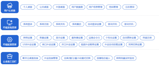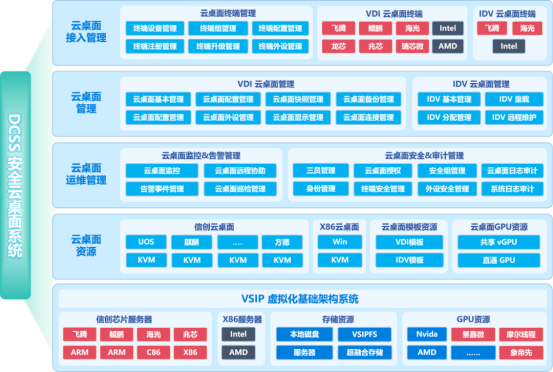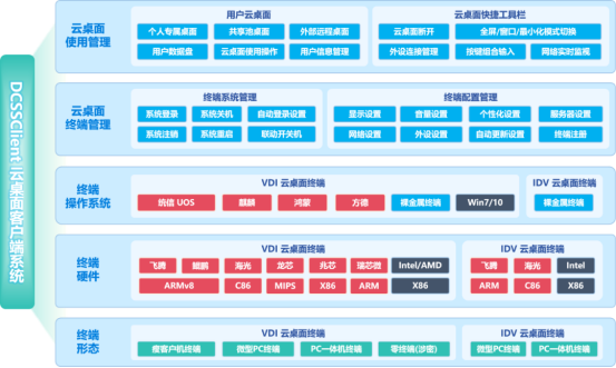 海誉云™ CloudBasis DCSSClient云桌面客户端系统(DCSSClient)可对VDI数据中心云桌面计算服务和IDV边缘端云桌面计算服务提供连接,全面支持飞腾、鲲鹏、海光、龙芯、兆芯等信创芯片终端和景嘉微、摩尔线程、象帝先等国产GPU,具备用户云桌面使用管理、云桌面快捷工具栏、云桌面终端管理、云桌面日志查询等核心功能。