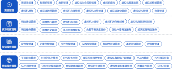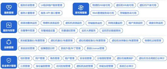 海誉云™ CloudBasis VSIP虚拟化基础架构系统将数据中心作为统一的云基座进行资源池化、计算虚拟化、网络虚拟化、存储虚拟化、资源调度监控及全生命周期安全审计管理,具备资源统一管理、资源调度管理、存储服务管理、网络服务管理、高可用管理、服务管理、运维管理、监控与告警管理、安全与审计管理等核心功能。