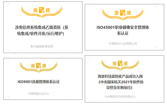 海誉科技根据国家“加快推进国产自主可控替代计划,构建安全可控的信息技术体系”的发展要求,结合国内及贵州省大数据核心技术与数字经济发展的实际需求,以长期被美国威睿(VMware)、思杰(Citrix)等公司垄断的云计算虚拟化平台核心产品技术领域为突破口,经过十多年持续研发投入,研制出具有自主知识产权的海誉云™CloudBasis信创虚拟化云平台产品家族,包括云平台虚拟化、云桌面虚拟化、终端虚拟化、应用虚拟化、存储虚拟化等五大类核心云平台软硬产品,填补了多项国内云计算平台技术领域的空白,并先后通过了工信部组织的信创虚拟化产品质量确认测试、金融信创产品测试和党政行业针对Win7停服桌面云解决方案测试,核心云平台虚拟化和云桌面虚拟化产品入选中国电子工业标准化技术协会信息技术应用创新工作委员会发布的信创产品图谱。