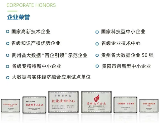 经过多年发展,公司先后荣获了国家高新技术企业、贵州省“专精特新”中小企业、贵州大数据Top50企业、贵州省“百企引领”示范企业和贵州省企业技术中心等荣誉。拥有专利19件,其中发明专利1件、实用新型专利12件外观专利6件,获得软件著作权72件,并获得了CMMI-5级、ITSS-3级等资质证书。