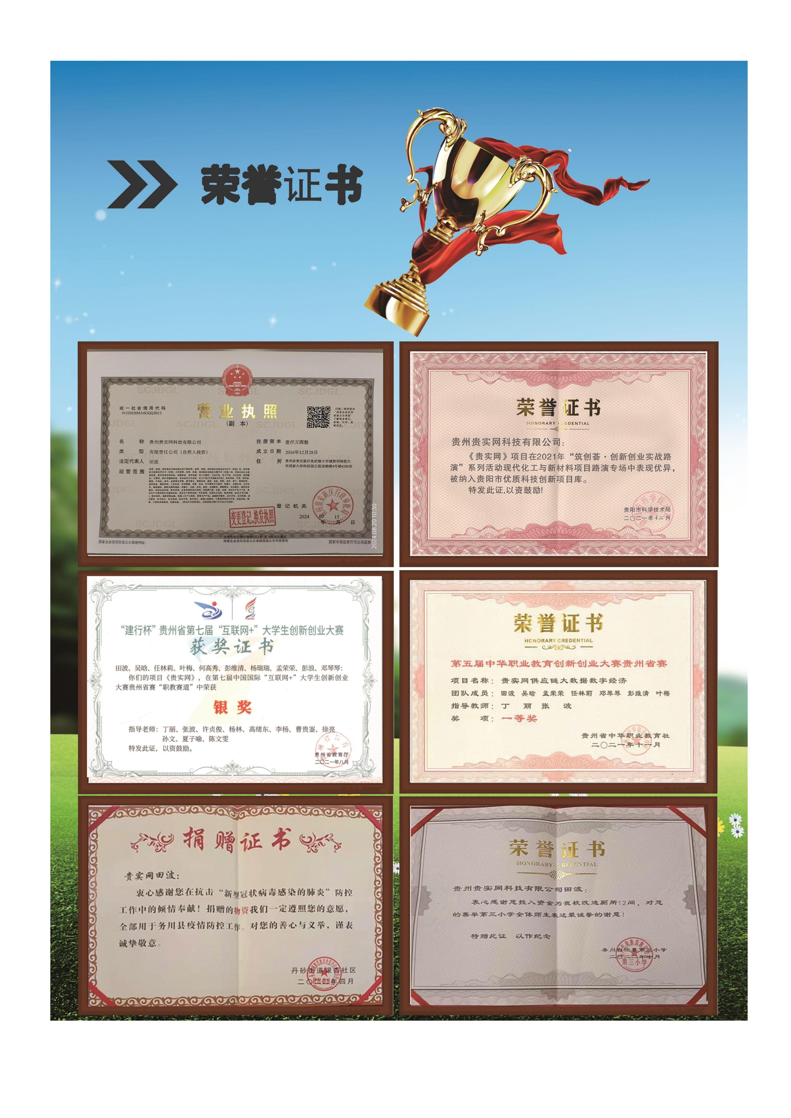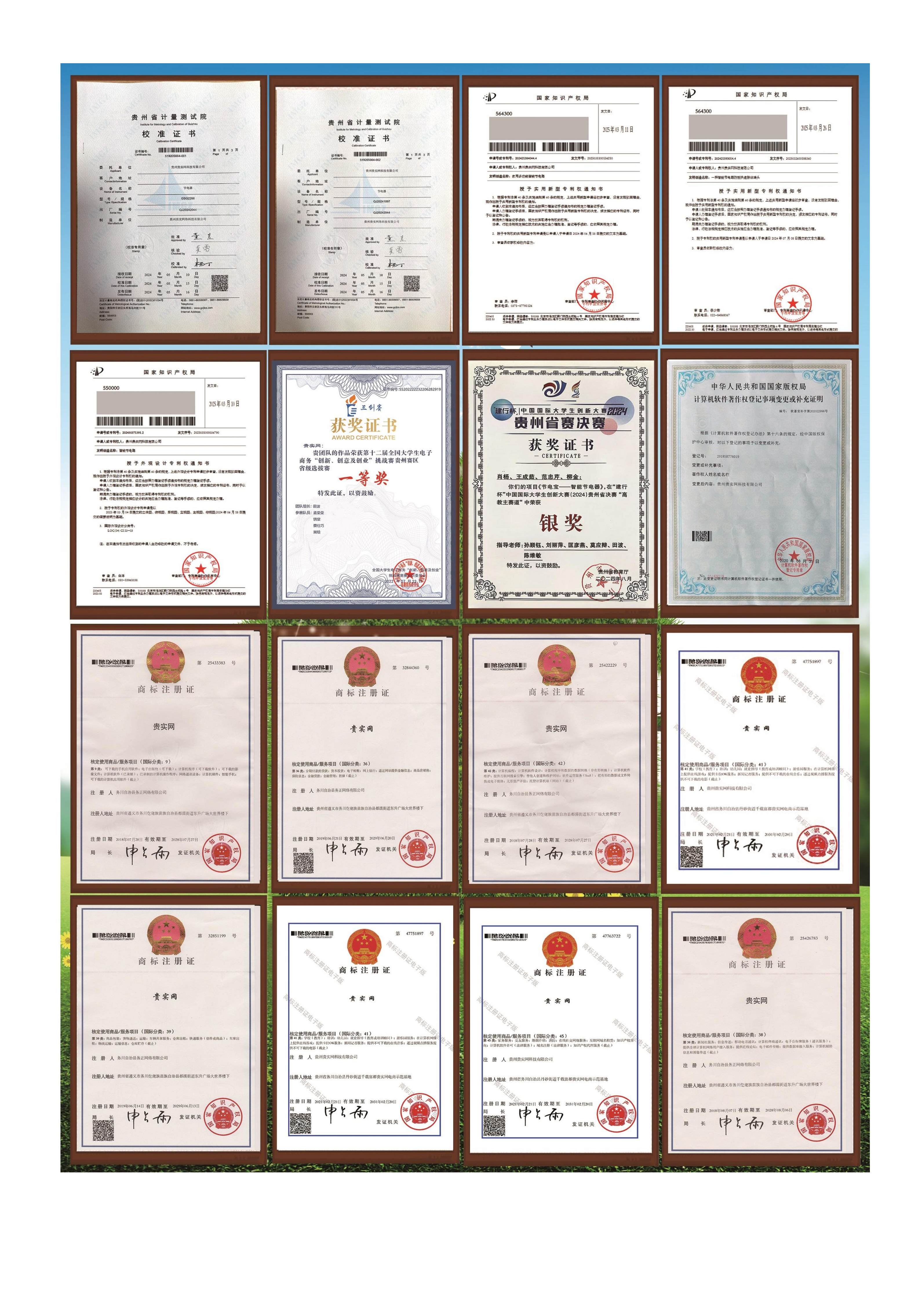 公司目前拥有12个商标,两个软著,五个实用新型专利等,公司贵实网项目被贵阳市科学技术局纳入贵阳市优质科技创新项目,并且在互联网 、三创赛、大学生服务外包、中华职业教育等大赛省赛中获得金奖、银奖多项。团队有来自全国各大高校的博士生、研究生、本科生组成的大学生创业团队。公司自主研发主推的产品有贵实网节电器、节水机等公益产品,目前在全国投放公益宣传已达上百万元,公司的产品和项目投资因其都是解决社会公益问题,所以基本都是处于完全开放状态,公司欢迎所有对公益行业有兴趣的投资者或使用者参与,请大家一定要珍惜能源,精准用电。为守护我们的家园做出自己的贡献。