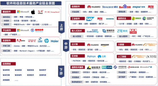 二是软件产业链和重点领域分析。基础软件、支撑软件、平台软件等与硬件连接最紧密的技术(如操作系统、中间件等基础软件),是最底层和核心的领域,占据着软件和信息技术服务业的上游。在中游环节,则由应用软件、工业软件、嵌入式技术、信息技术服务、信息安全等应用与服务组成,并且在新一代信息技术迅速发展与更新的背景下,以区块链、云计算、大数据、人工智能为代表的新兴领域不断壮大软件应用和服务层面。产业链的下游便是面向用户的各行业领域,涉及了从航空航天、汽车制造等到个人用户使用的各类场景,在数字化进程中还衍生出了智慧金融、智慧医疗、智慧教育等多个新的领域。