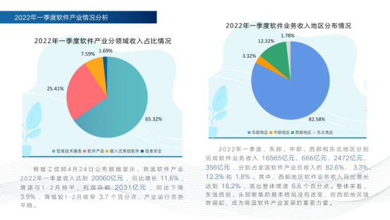 一是软件产业发展的全球格局、我国现状及未来趋势。全球软件产业市场格局体现在美国仍占据产业链核心地位,中国在应用软件领域发展势头迅猛。我国软件产业发展现状是总体处于快速增长阶段,发展态势良好,“强者恒强”马太效应凸显。我国软件业发展趋势是软件产业进入全面革新调整的关键期,总体发展仍处于重要战略机遇期。