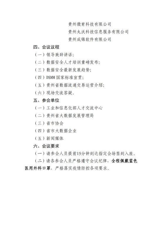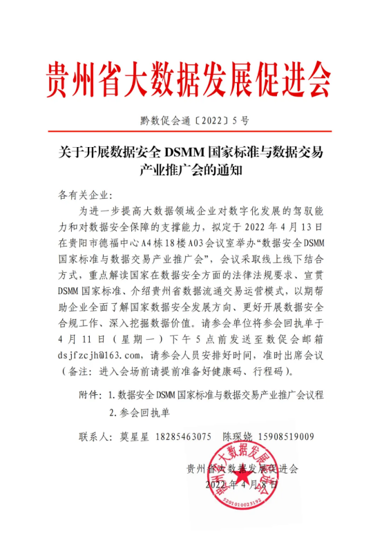 为进一步提高大数据领域企业对数字化发展的驾驭能力和对数据安全保障的支撑能力,拟定于2022年4月13日在贵阳市德福中心A4栋18楼A03会议室举办“数据安全DSMM国家标准与数据交易产业推广会”,会议采取线上线下结合方式,重点解读国家在数据安全方面的法律法规要求、宣贯DSMM 国家标准、介绍贵州省数据流通交易运营模式,以期帮助企业全面了解国家数据安全发展方向、更好开展数据安全合规工作、深入挖掘数据价值。请参会单位将参会回执单于4月11日(星期一)下午5点前发送至数促会邮箱dsjfzcjh@163.com,请参会人员安排好时间,准时出席会议(备注:进入会场前请提前准备好健康码、行程码)。