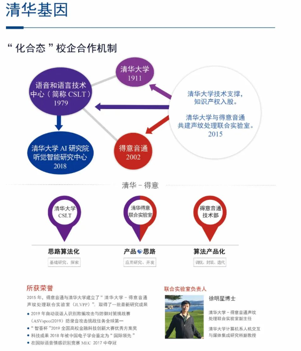 得意音通核心技术源自清华,完金自主可控。创始人郑方博士,系清华大学教授,清华大学语音和语言技术中心主任,清华大学人工智能研究院听觉智能研究中心主任,北京信息科学与技术国家研究中心智能科学部常务副主任及语音和语言技术团队负责人。得盘音通于2015年岛清华大学成立“清华大学-得童音通声纹处理联合实验室",2017年组建得意音通信息技术研究院,延聘全球顶级人工智能专家,由张钱院士(中)和庄炳湟院士(美)任联席主任,其“基于动态密码语音的无监督身份认证系统融合声纹识别、语音识则和情感识别,集成防最音攻击(在国际自动说话人验证欺骗和对策战赛ASVgpoof2019 中获冠军)、防时变、真实意图检测(其主要支撑技术之一的情略识别在国际音频情感识别竞赛MFC2017 中获冠军)等功脆,该系统于2018年5月被中国电子学会组织的科技成果鉴定评价为“整体处于国际领先水平"