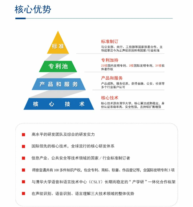 得意音通主导起草了截至目前声纹识别领城所有的国家和行业标准,并推动了声纹识别产业化进程。其中,《移动金融基于声纹识别的安全应用技术规范》已于2018年10月9日由中国人民银行颁布至各银行,证券,保险,基金,以及非银行支付机构,成为我国金融领域第一个生物特征识别安全应用技术标准;《中国声纹识别产业发展白皮书》于2019年4月由AIIA- 得惠音通联合实验室发布,系我国第一份声纹识别产业报告:"声纹识别系统”于2019年 10月被国家市场监管总局、中国人民银行列入我国首批金融科技产品认证目录,是第一个进入该目景的生物特征识别产品品类:公司旗舰产品“声密保"于2019年11月获得中会国盛认证中心颁发的"移动金融技术服务认证"证书,是我国首个获得该牌照的声纹识别产品。