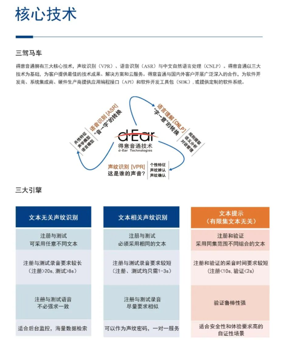 北京得惠音通技术有限责任公司(简称“得意音通")成立于 2002年,是清华大学知识产权入股的高科技企业、中国人工智能产业发展联盟銫钟砕沮斎陶AIIA)理事单位、互联网金融身份认证联盟(HIFAA)理事单位,是拥有完全自主知识产权的声纹识别(VPR)、语音识别(ASR)与中文自然语言处理(CNIP)领域的技术研发商、产品开发商和服务提供商。得音通在声识别这一被美国列为战路安全技术的禁运领域居国际领先地位。