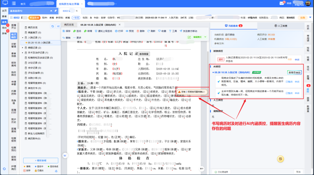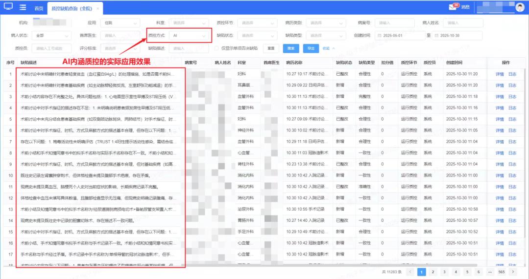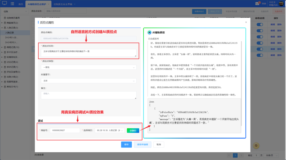 面向临床病历书写和病历质量管理多场景,将AI辅助智能质控与传统规则质控相结合,依托大模型对医疗文书和病历书写规范的强大理解分析能力,实现深度病历内涵质控。在自然语言质控点的框架下,病历书写规范、病历评分标准即AI质控点,人工抽查的真实问题即AI质控点,让机器质控高度接替质控人员的工作。在临床端,医生不仅能够得到科学合理的质控建议,还能够了解AI的分析过程,加强对临床的干预和宣贯。整体上实现从“事后审查”到“事中干预”的转变,促使病历质量管理效能提升。