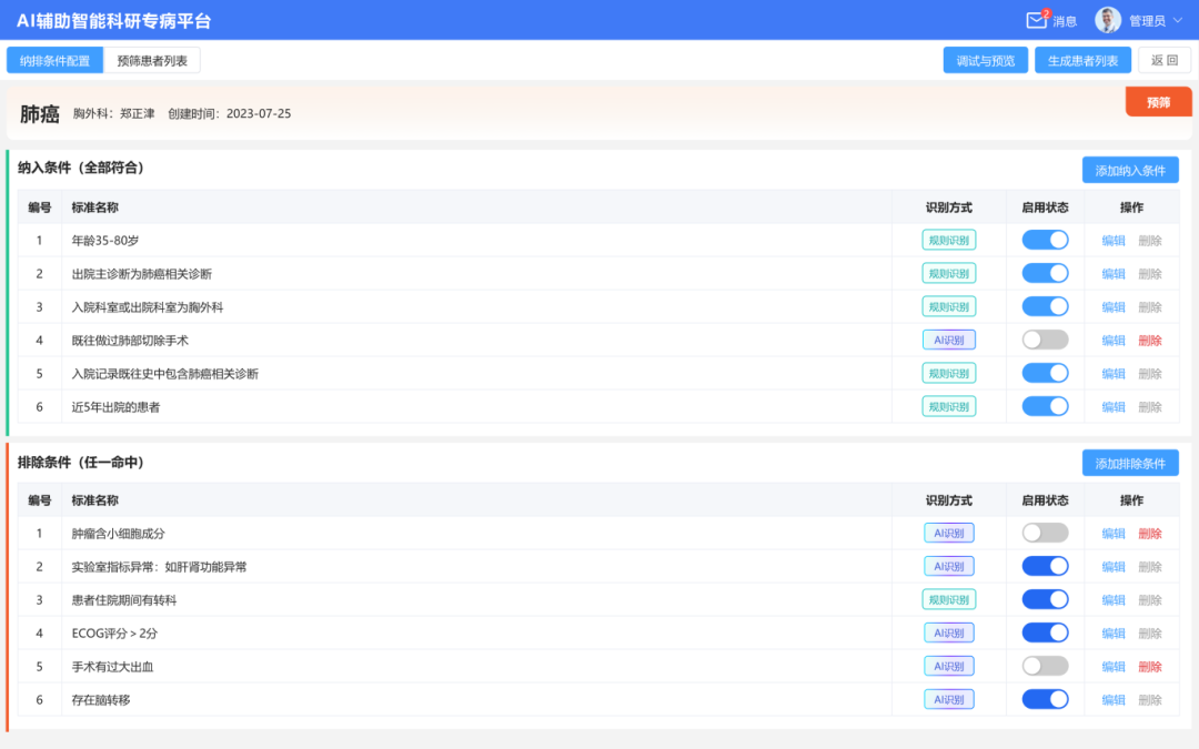 面向科研场景,基于大模型自然语言分析和图片识别能力,提取标准化的科研数据。依托AI识别,医生可以按早期设想完成智能纳排预筛,持续探索专病研究方向,并在实践中迭代改进。