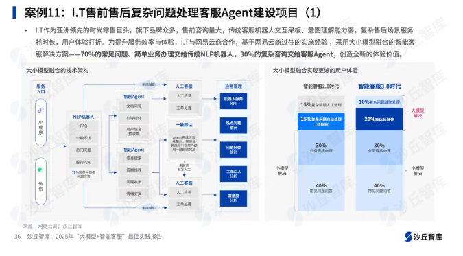 I.T作为亚洲领先的时尚零售巨头,旗下品牌众多,售前咨询量大,传统客服机器人交互呆板、意图理解能力弱,复杂售后场景服务耗时长,用户体验打折。为提升服务效率与体验,I.T与网易云商合作,基于网易云商过往的实施经验 ,采用大小模型融合的智能客服解决方案——70%的常见问题、简单业务办理交给传统NLP机器人,30%的复杂咨询交给客服Agent,创造全新的体验价值。