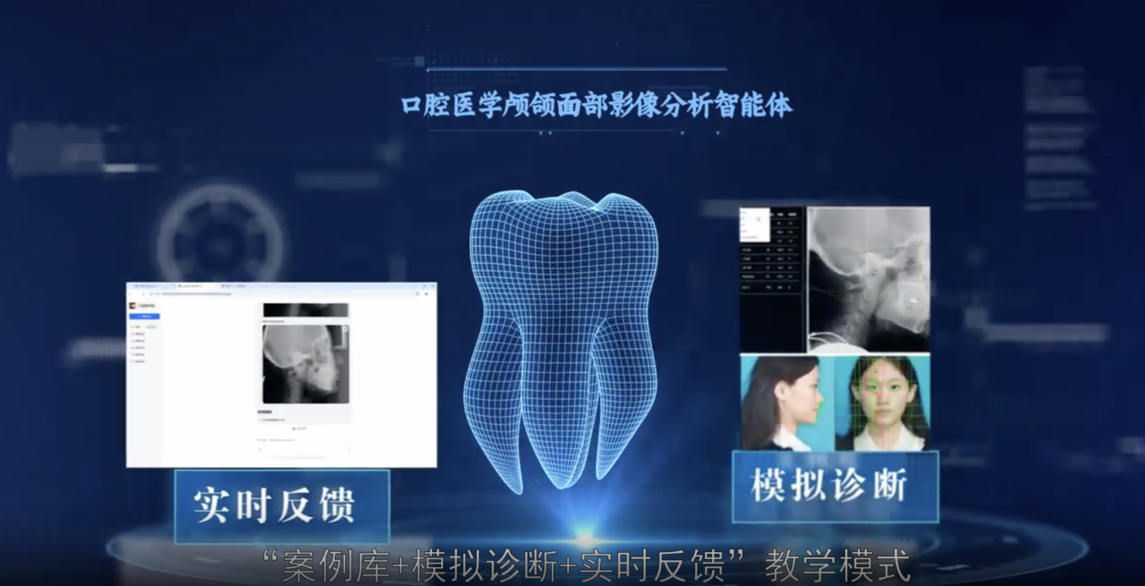 西安交通大学口腔医院基于院内90万例多模态病例数据,研发自动定点算法,实现口腔颅颌面部影像智能识别和诊断;构建“口腔医学颅颌面部影像分析智能体”,生成各类典型教学案例;首创“案例库+模拟诊断+实时反馈”教学模式,帮助学生沉浸式学习复杂牙颌面畸形案例,提升诊断思维;同时构建多语言知识问答库,赋能留学生教育。目前利用该智能体已生成200余例典型案例,累计交互学习过万次,学员覆盖中、伊、泰等多个一带一路国家,为全球口腔领域的智慧教育发展提供了可复制的技术范式。