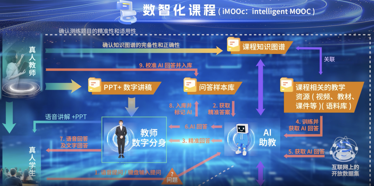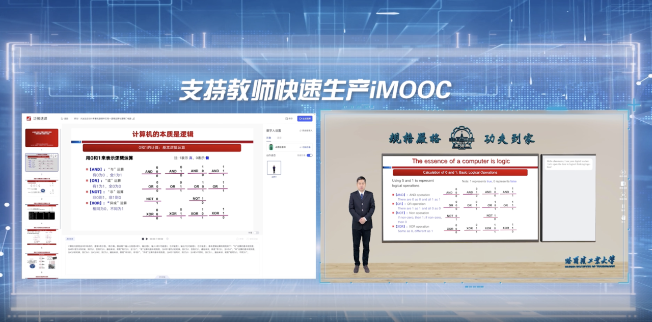 我国慕课规模居世界第一。传统慕课更新困难、交互性弱,专业课程面临语言翻译出海难。提出多语言多场景多教师i慕课新模式,利用课程知识图谱、视频与数字教材训练AI模型,利用AI多模态合成实现数字分身讲课,利用AI多语言翻译实现专业课翻译并校正,利用AI虚拟场景生成实现学生沉浸式学习,利用AI问答生成实现实时答疑解惑,进而研发建设i慕课制作智能体,服务教师快速制作与更新教学资源,已应用于数十所高校的超百门课程改革。《计算思维与人工智能》示范课建设了完整知识图谱和40讲教学内容,生成中、英、俄、韩、法版本视频40*5个,与AI助教相结合的问答题目2000余,覆盖海内外学习者数万人。案例对推动核心课程数字化转型、慕课提质升级“出海”具有引领示范作用。