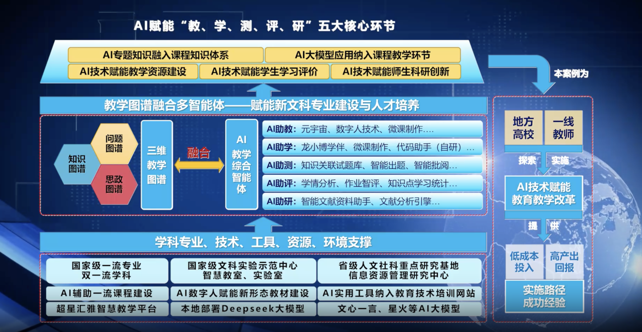 黑龙江大学积极响应“AI+高等教育”的国家战略,依托省内高校首家本地化部署DeepSeek、汇雅等大模型和智慧教学平台,构建了基于“知识图谱+问题图谱+思政图谱”的本研师一体教学图谱,打造了“教、学、测、评、研”系列AI教学智能体,积极探索出一条适合地方综合性大学新文科专业本研师一体“教学图谱融合多智能体”的建设路径,并应用于文学、管理学等国家级一流专业和外国语言文学、中国语言文学、信息资源管理等国家双一流学科的新文科建设与教育教学改革中,在学科交叉融合课程群与知识体系建设、大模型助力智能化教学互动、AI技术赋能教学资源建设及学习评价等方面取得良好效果。该案例相关教学改革与建设成果显著,为地方高校教师提供了低成本、高成效的AI赋能教学改革实施路径和成功经验。