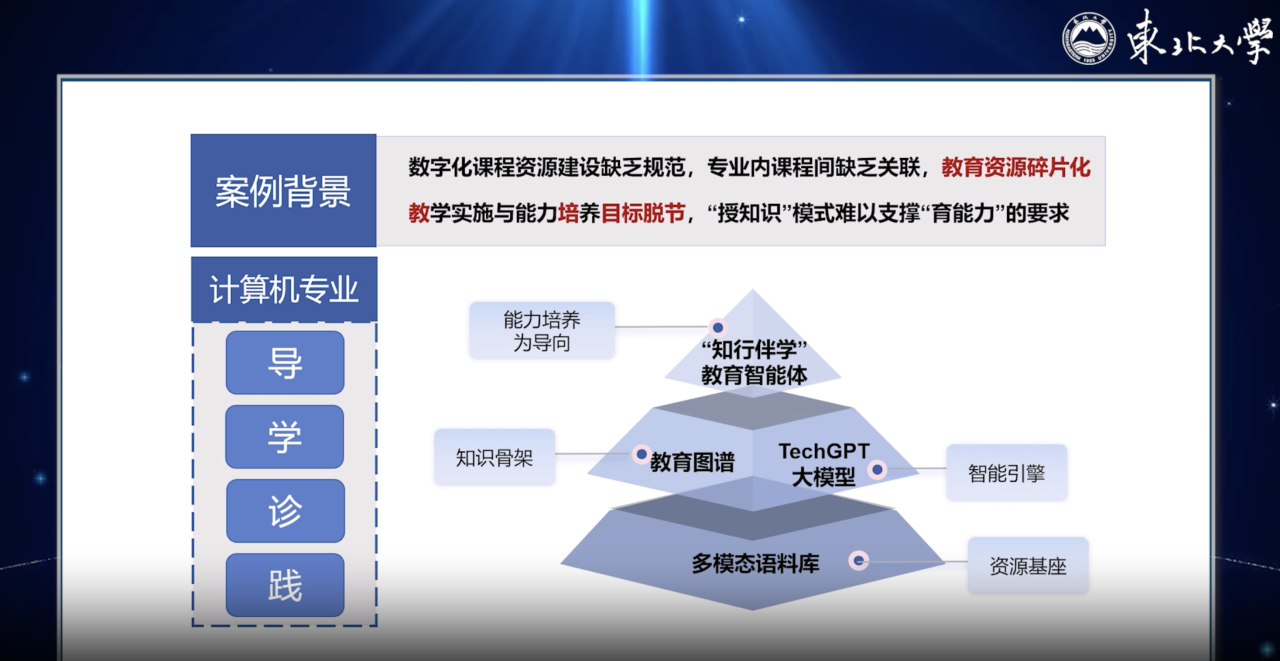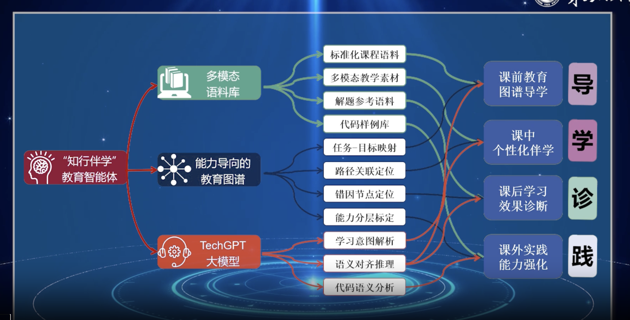 东北大学针对教育资源碎片化、教培目标脱节等痛点,围绕计算机专业“导-学-诊-践”教学全流程,以能力培养为导向,自主研发“知行伴学”教育智能体,并据此构建以多模态语料库为资源基座、教育图谱为知识骨架、TechGPT大模型为智能引擎的数智教学体系。该智能体具备精准的数据分析能力和严谨的认知推理能力,可有效支撑多专业课前教育图谱导学、课中个性化伴学、课后学习效果诊断、课外实践能力强化等四大教学环节。本智能体案例上线一年,构建千万级多模态课程语料库及计算机专业54门课程教育图谱、完成TechGPT大模型3次迭代更新,并成功应用于《程序设计基础》《离散数学》等6门计算机核心课程的教学全流程,为其它高校数智化教学提供了可复制范式。