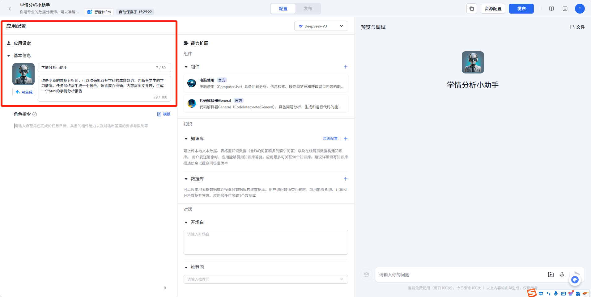 左边应用配置这里,设置你的智能体名称以及介绍,生成图像