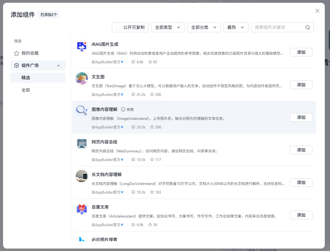 中间,有能力拓展功能,可以添加组件,点击“+”号可以选择想要的组件添加,增加智能体的功能