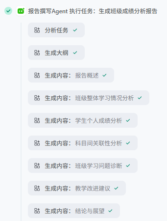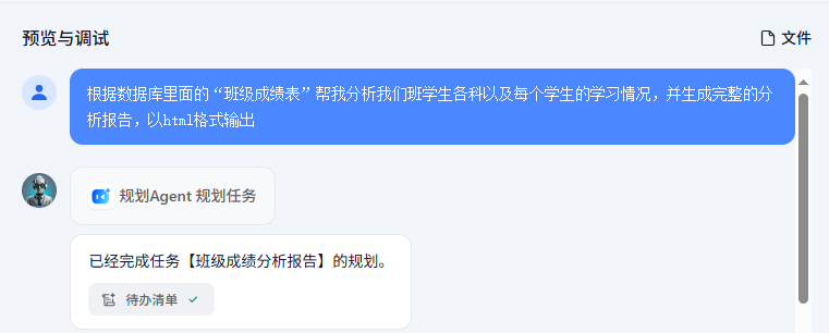 比如这里,我希望它根据数据库里面的“班级成绩表”帮我分析我们班学生各科以及每个学生的学习情况,并生成完整的分析报告,以html格式输出