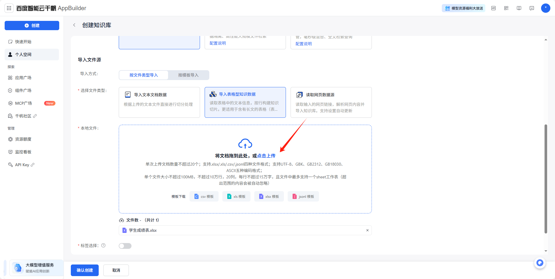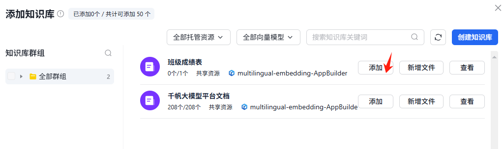 下面进行【知识库】和【数据库】添加,上传我们的学情分析数据表以及分析依据等