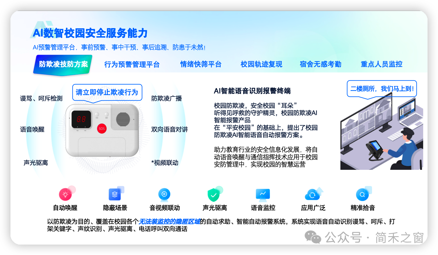 以防欺凌为目的、覆盖在校园各个无法装监控的隐匿区域的自动求助、智能自动报警系统,系统实现语音自动识别谩骂、呵斥、打架关键字、声纹识别、声光驱离、电话呼叫双向通话。