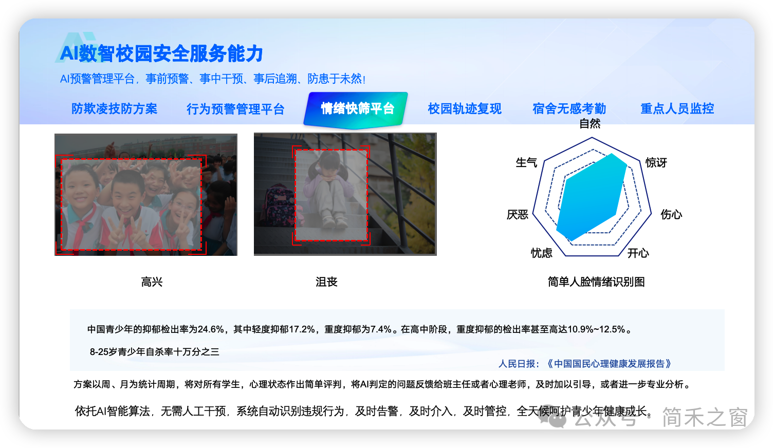 通过人脸识别分析学生情绪,发现问题及时推送班主任或心理老师。依托AI智能算法,无需人工干预,系统自动识别违规行为,及时告警,及时介入,及时管控,全天候呵护青少年健康成长。