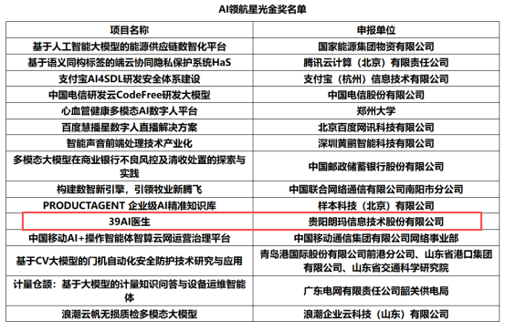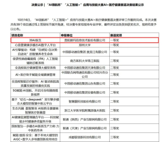 中国互联网协会近日正式发布首届“AI领航杯”全国“人工智能+”应用与技能大赛AI医疗健康赛道决赛结果,贵阳朗玛信息技术股份有限公司自主研发的“39AI医生”医学大模型从全国38个参赛项目中脱颖而出,斩获该赛道一等奖。