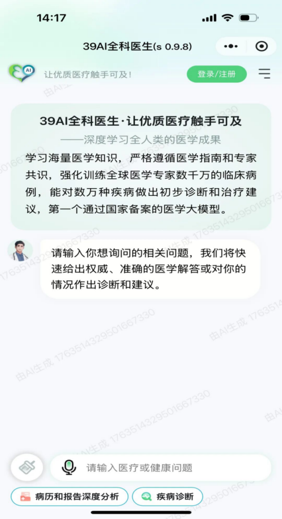 在临床应用方面,“39AI医生”(医院版)已在广西医科大学附属第一医院、北京丰台区右安门医院、南方医科大学附属中西医结合医院、广西玉林市第一人民医院等国内多家三甲医院接入使用。贵阳市已有31家公立医院试用及近10家贵州省头部民营医疗机构投入使用,全面覆盖贵阳市187家社区卫生服务中心(乡镇卫生院)。截至目前,贵阳贵安基层医疗卫生机构已有1651位医生开通服务账号,累计提供咨询及问诊服务43万余次。