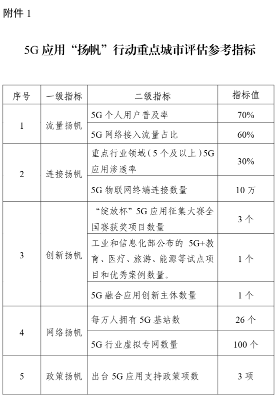 1. 5G应用“扬帆”行动重点城市评估参考指标