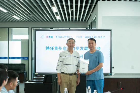 会议传达学习了中国共产党贵州省第十三次代表大会精神。贵州省政协原副主席、贵州省大数据发展促进会名誉会长谢晓尧作“推进‘东数西算’工程建设全国一体化算力网络国家(贵州)枢纽节点”的致辞讲话。会议同意唐振江同志因个人原因请辞贵州省大数据发展促进会法定代表人及会长职务,聘任唐振江同志为贵州省大数据发展促进会首席顾问,谢晓尧名誉会长为唐振江同志颁发了贵州省大数据发展促进会首席顾问证书。