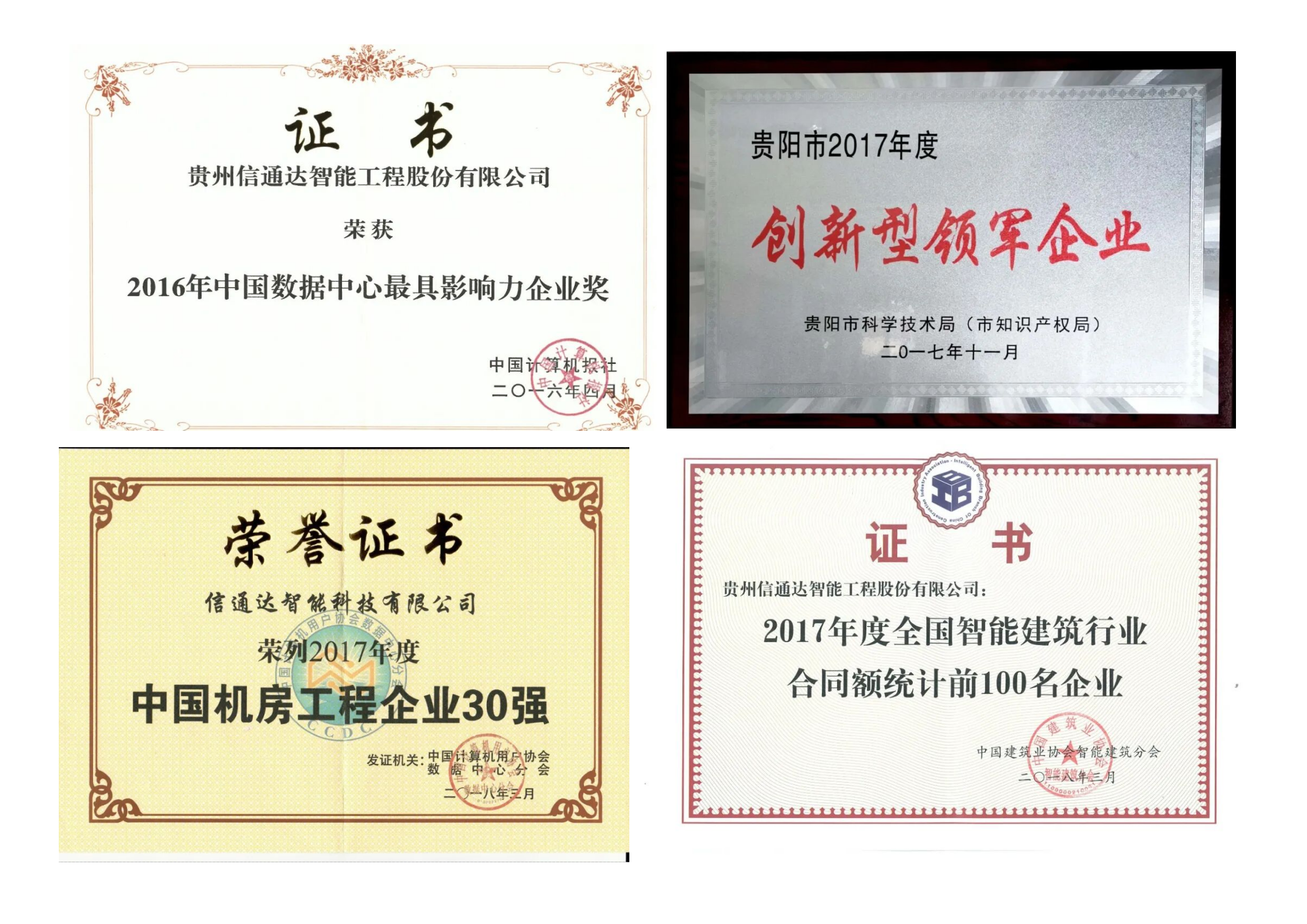4、荣获“2017年度全国智能建筑行业合同额统计前100名企业”